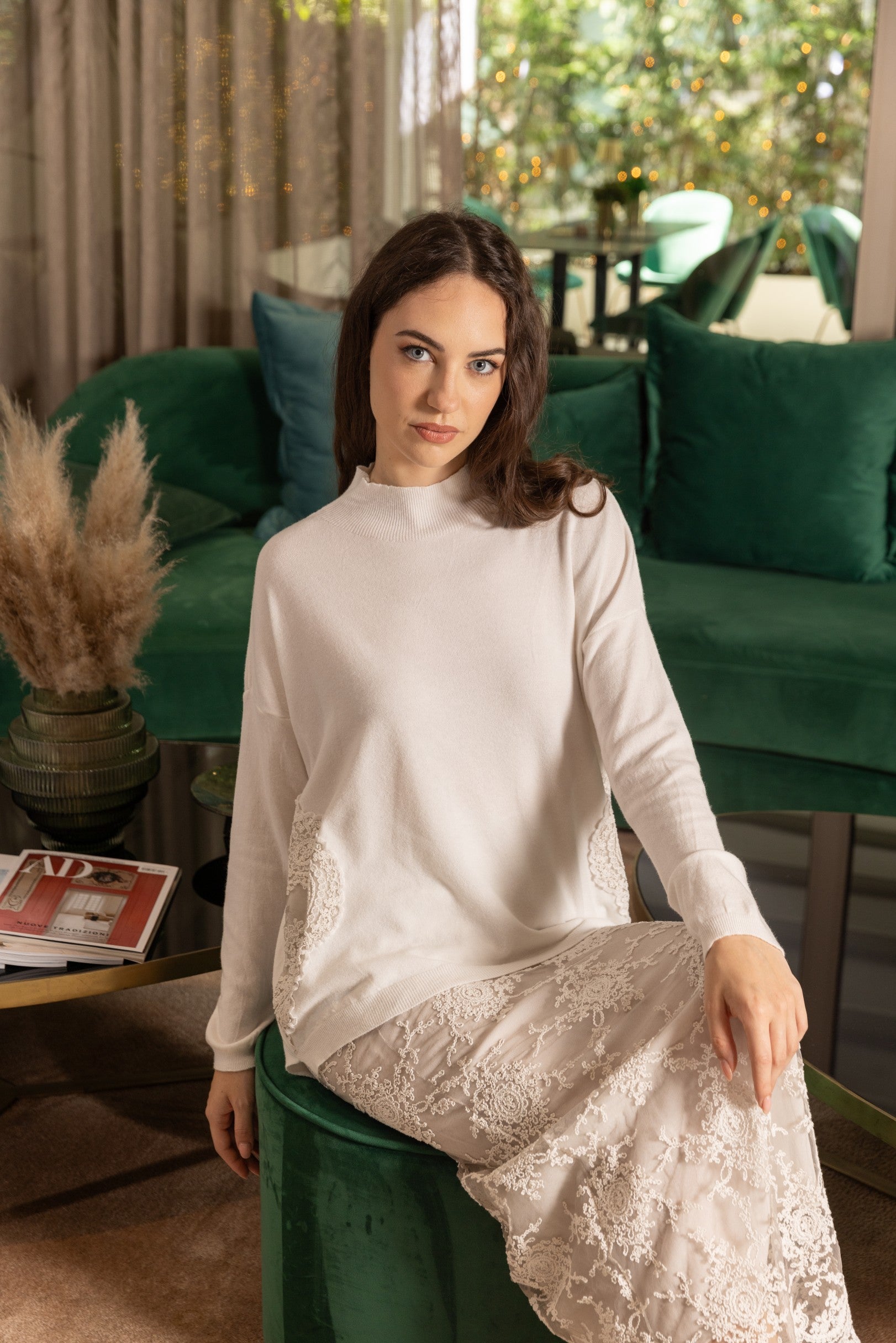 Preziosa maglieria, maxi abiti, caftani, tuniche in lino e pizzo, morbide bluse, coprispalle e top in pizzo, capi iconici che vestono con eleganza la donna moderna e femminile