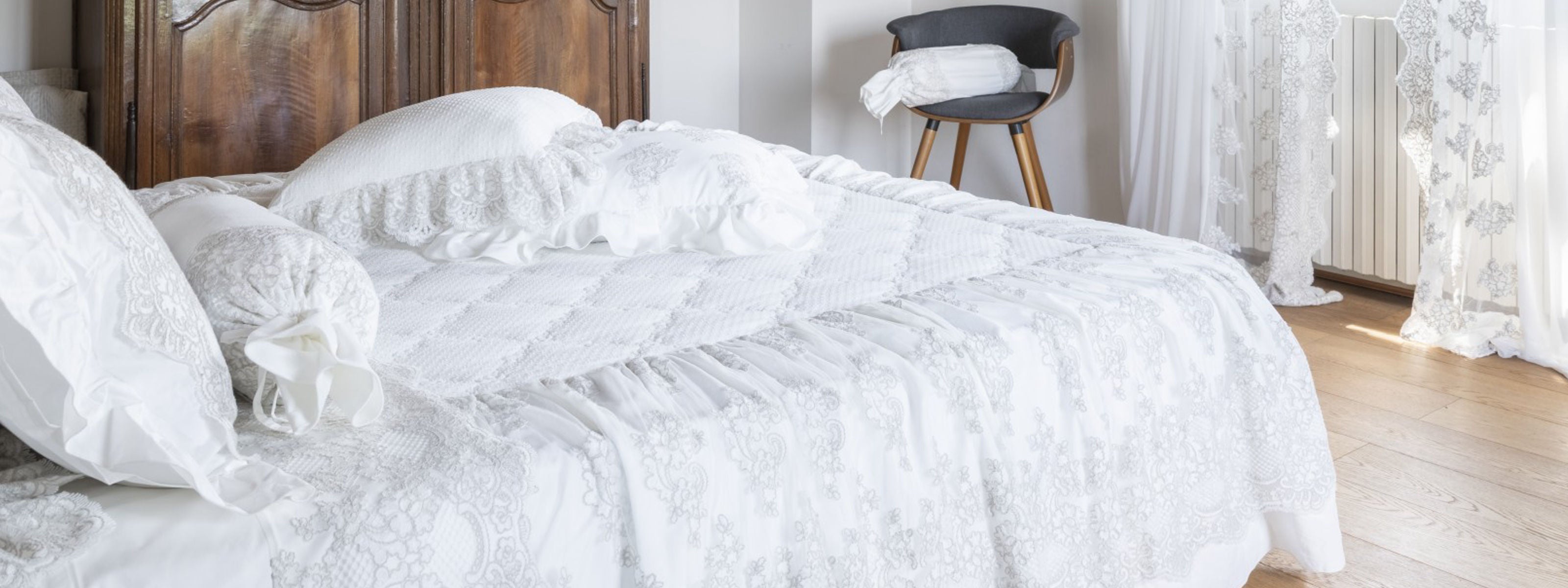 Tovaglie in puro lino, tende sontuose, lenzuola in raffinato percalle, trapunte, morbide spugne per il bagno, capi unici per arredare con stile ogni stanza della casa