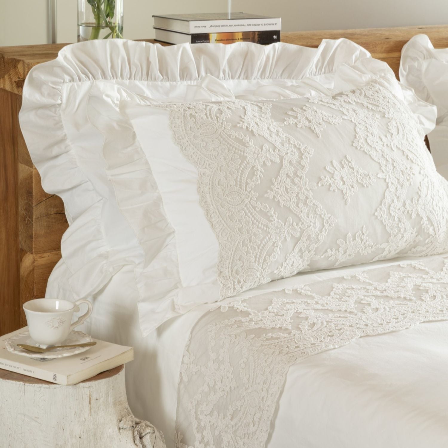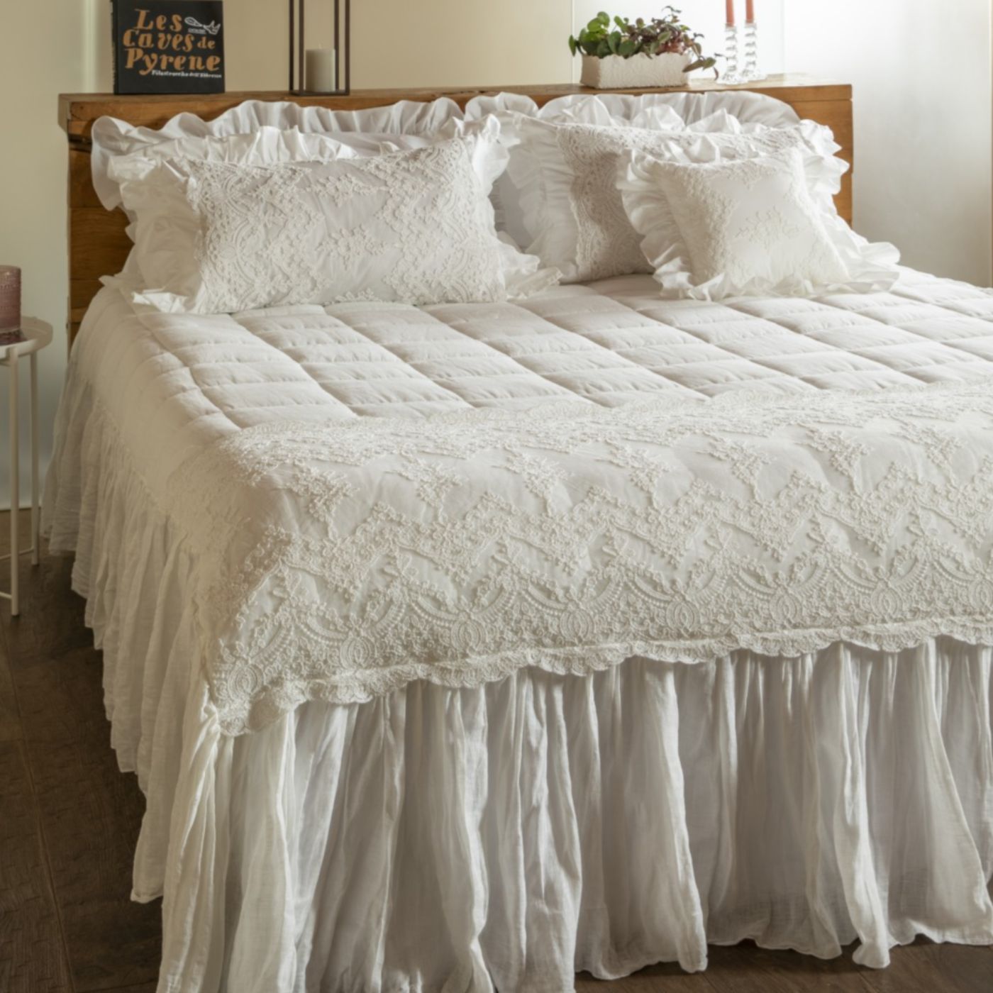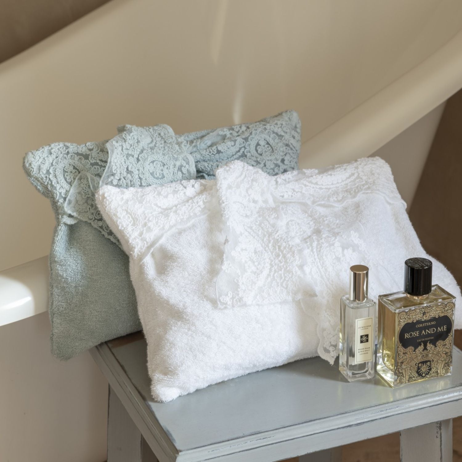 Realizzata con tessuti morbidi e avvolgenti, come la soffice spugna e il candido lino, ogni pezzo è impreziosito da pizzi e volant che aggiungono un tocco di eleganza e raffinatezza. Un vero lusso per il tuo bagno, per trasformare ogni momento di benessere in un'esperienza unica e avvolgente.