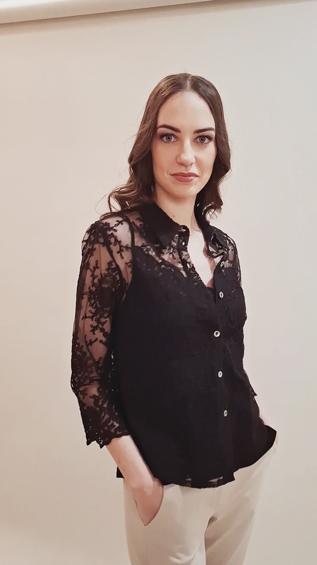 Made entirely of fine Corinthian Lace, it stands out for its delicate and detailed workmanship, which creates a fascinating play of transparencies. The feminine cut and fluid fit enhance the silhouette with grace, while the discreet buttons and refined collar add a touch of class.