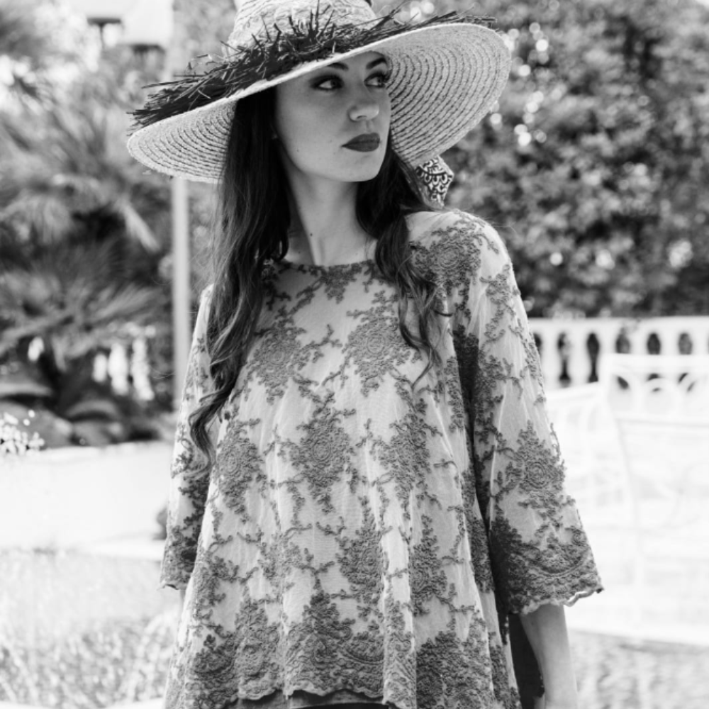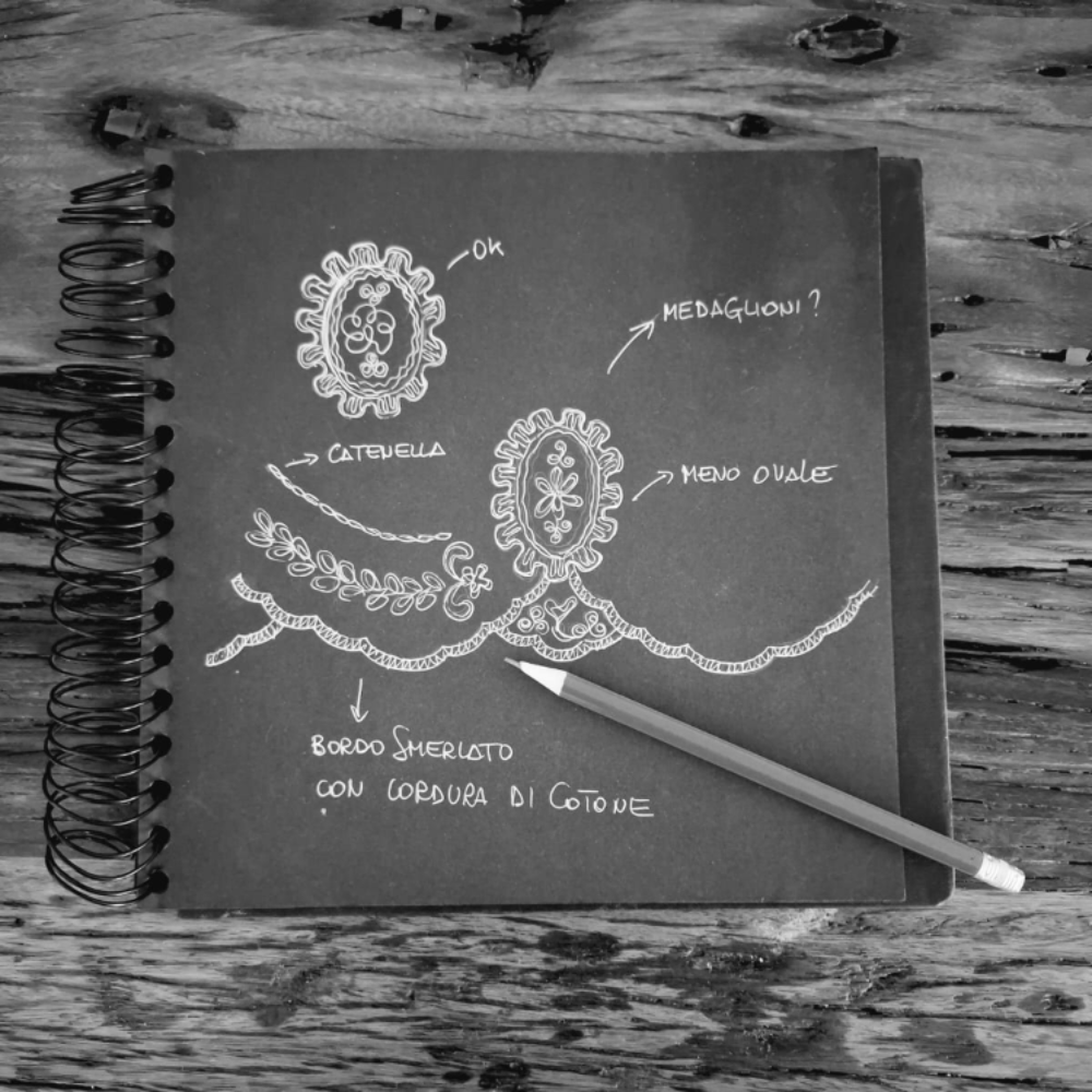 Il pizzo, icona e vero emblema del marchio, viene concepito e disegnato da Sheila e Alessandro e viene ricamato secondo le loro indicazioni. Il pregiato tessuto così ottenuto viene poi passato alle abili mani delle sarte che lo sposano ad altri tessuti ricercati e danno così origine a capi iconici, unici, facilmente riconoscibili perchè riflettono un gusto strettamente personale, al di là di convenzioni e tendenze.