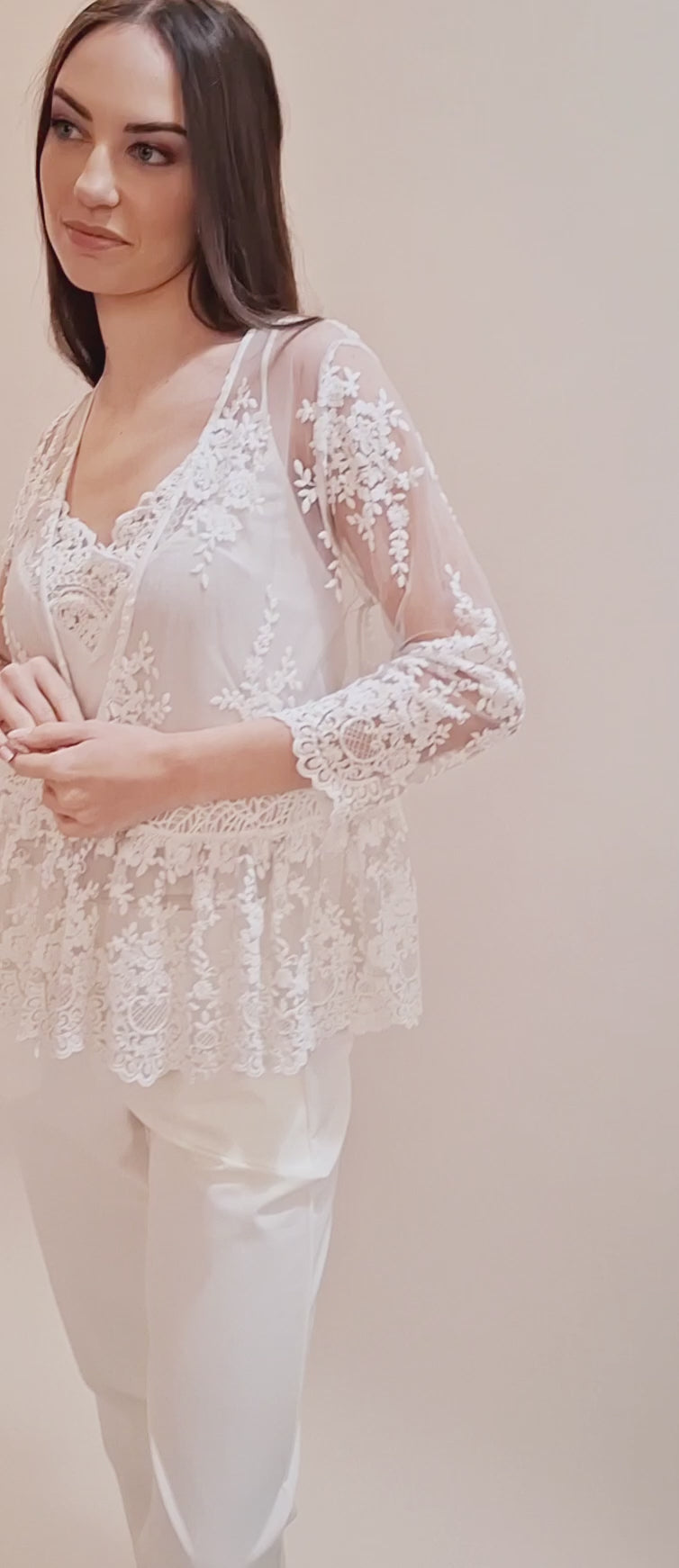Realizzato interamente in pregiato pizzo, si distingue per la sua lavorazione dettagliata che crea un effetto sofisticato e leggero.